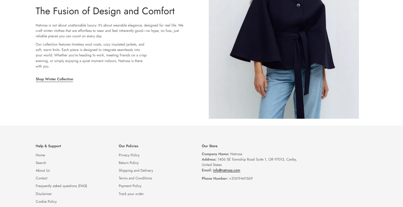 Natrosa.com is an online fashion retailer that claims to sell women’s clothing — including dresses, coats, tops, pants, and seasonal outfits. The site presents itself as a boutique with a focus on modern and affordable fashion. According to its own About Us section, the company says it curates clothing collections to help women feel confident and stylish, promising a range of sizes including plus sizes.